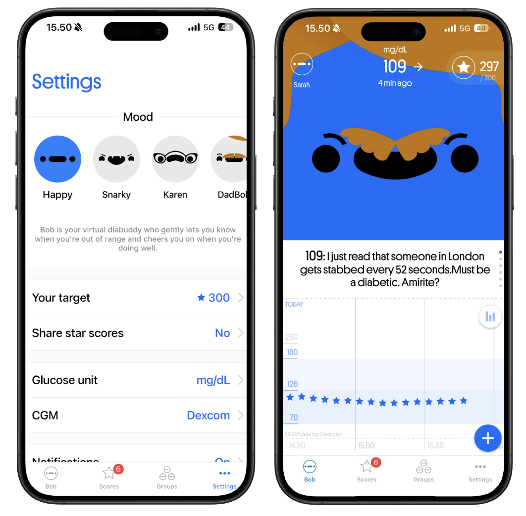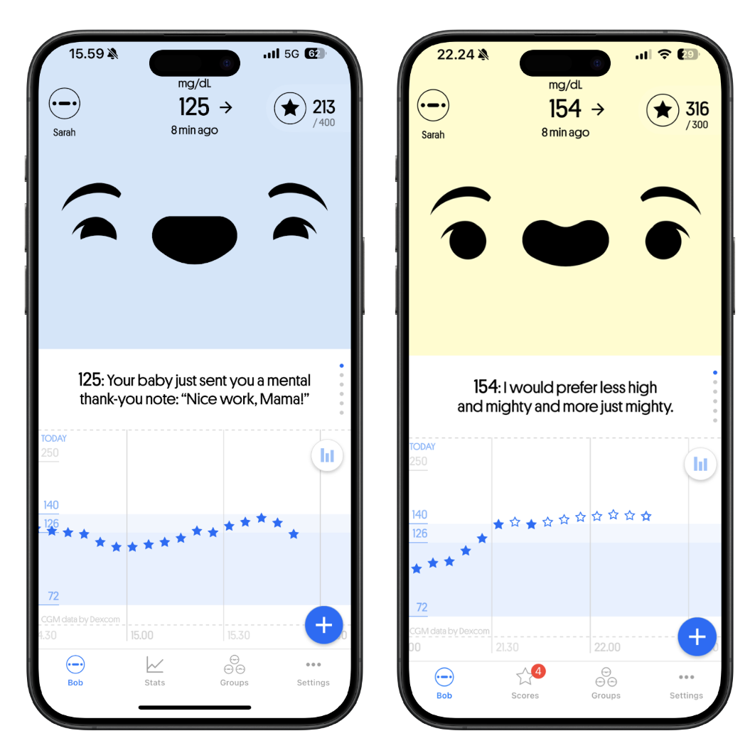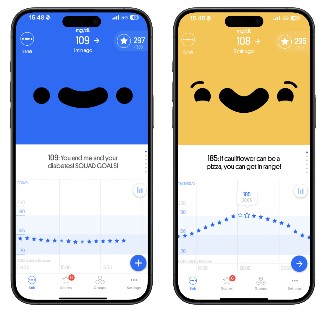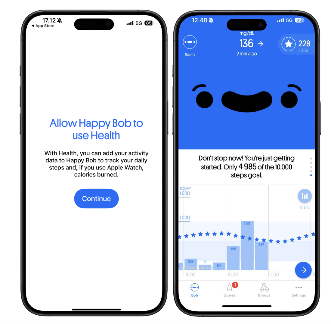 Happy Bob is designed to help you monitor your glucose levels in a fun way. Happy Bob connects to your CGM and helps you monitor your glucose levels throughout the day while notifying you with personal messages. Keeping your glucose within the target range earns you stars. The purpose of Happy Bob is to motivate users in self-care by offering a rewarding and encouraging experience.