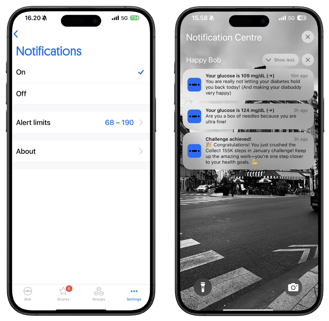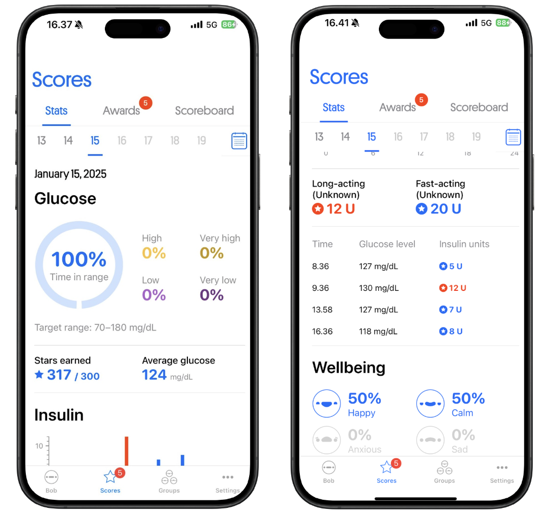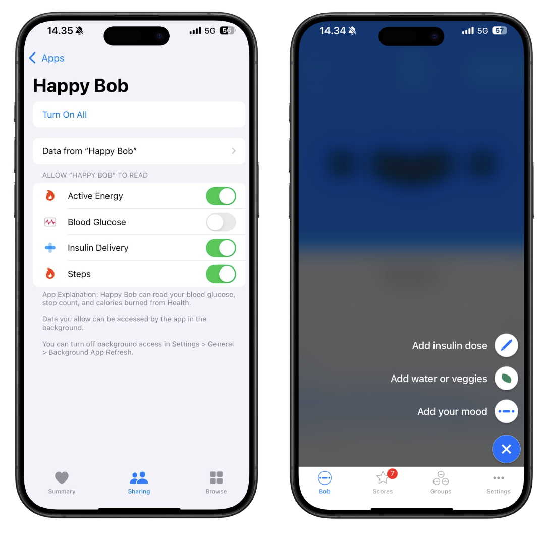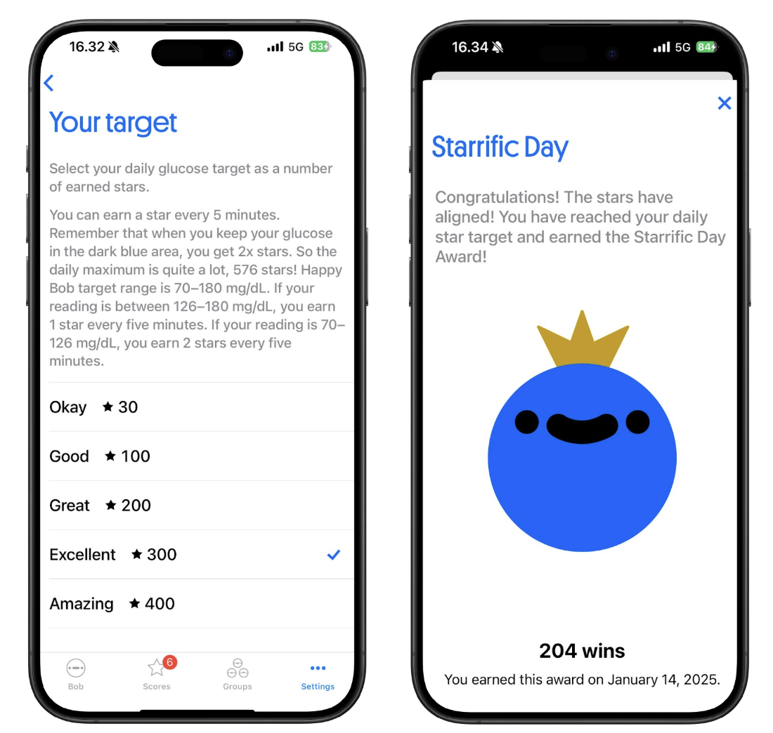 Happy Bob is designed to help you monitor your glucose levels in a fun way. Happy Bob connects to your CGM and helps you monitor your glucose levels throughout the day while notifying you with personal messages. Keeping your glucose within the target range earns you stars. The purpose of Happy Bob is to motivate users in self-care by offering a rewarding and encouraging experience.